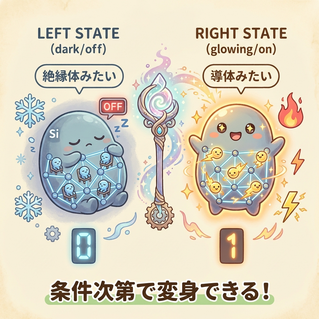 ✅ 半導体 = 条件次第で変わる = ON/OFF切り替え可能(シリコン)
