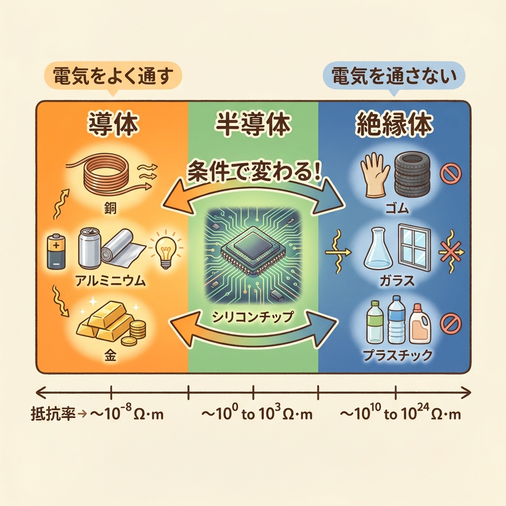 | 代表的な材料 | 銅、アルミ、金、銀、鉄 | ゴム、ガラス、プラスチック、空気 | シリコン(Si)、ゲルマニウム(Ge) |