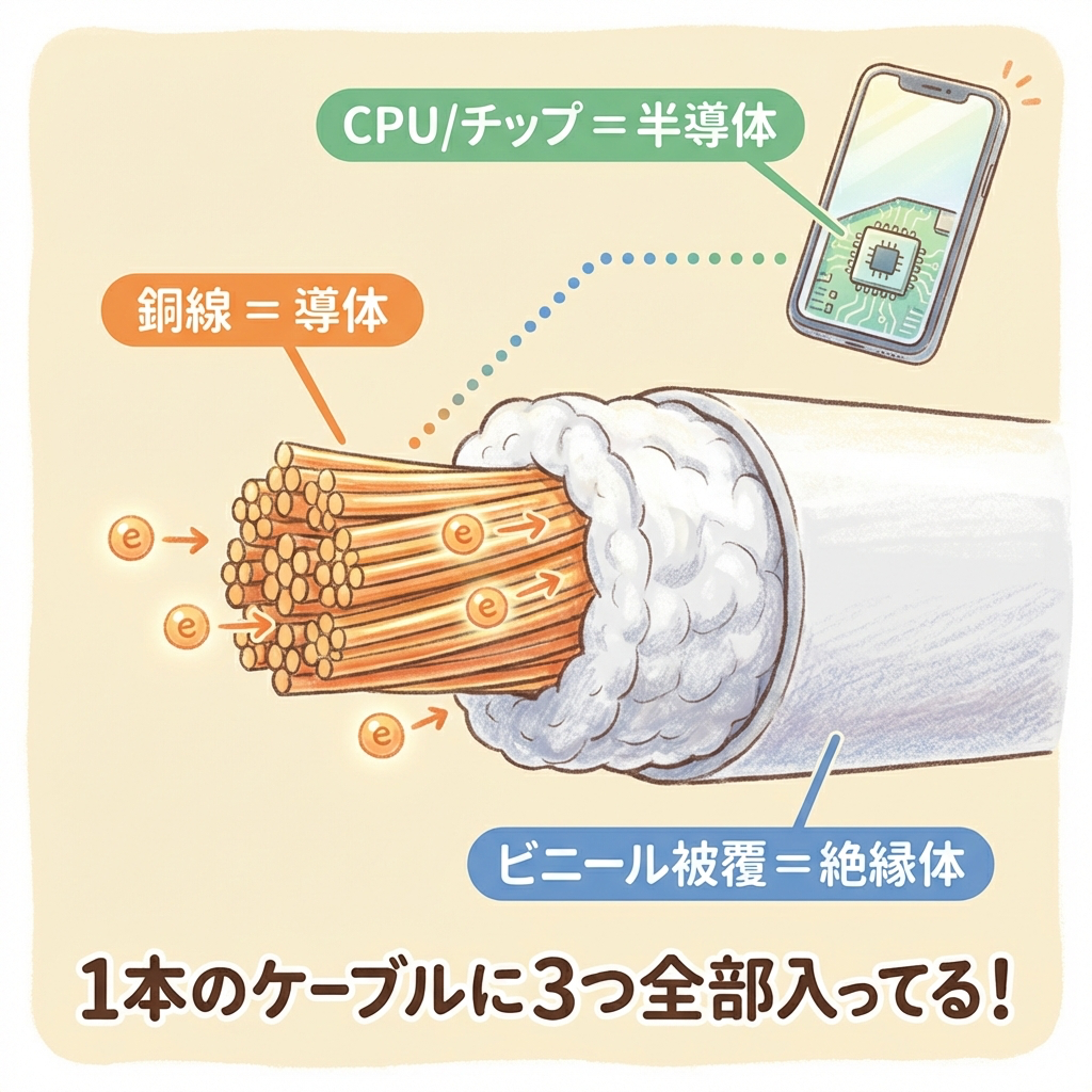実は、普段使っている製品の中には導体・絶縁体・半導体の3つすべてが使われています。スマホの充電ケーブルを例に見てみましょう。