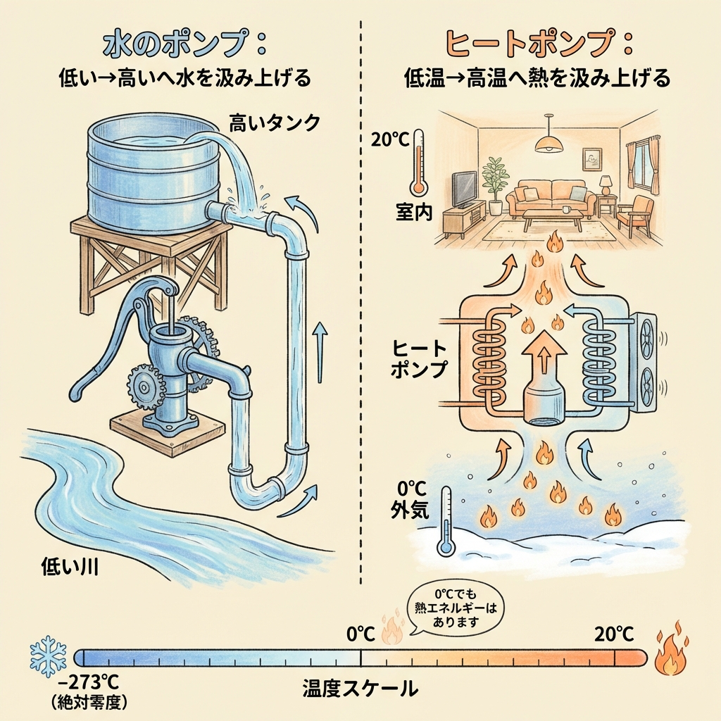 実はこの疑問、電気の世界でも最も「魔法のように見える」仕組みの一つです。その正体が「ヒートポンプ」。