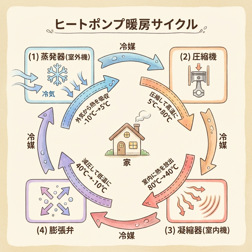 配達員(冷媒)が4つのステーション(部品)をグルグル回ることで、外の熱を室内に届けます。