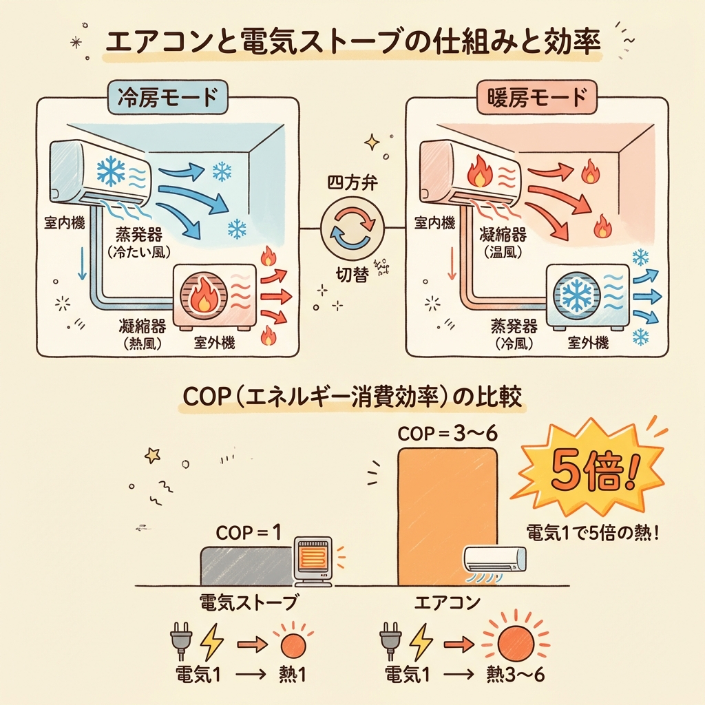 エアコンが電気ストーブの3〜6倍効率的な理由(COP)