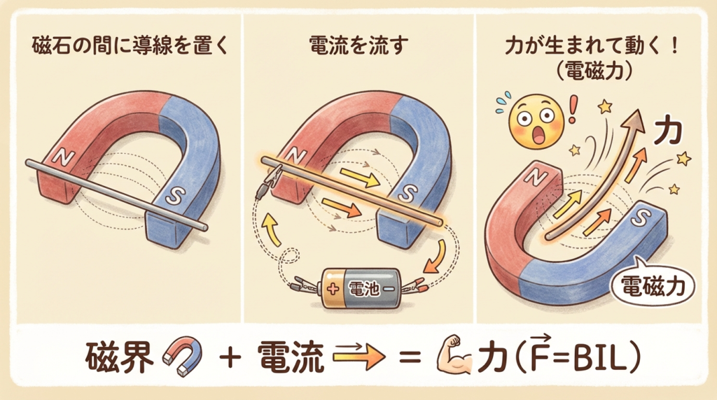 モーターを回す力「電磁力」の大きさを計算する方法。磁束密度B・電流I・導線の長さLの関係を学べます。