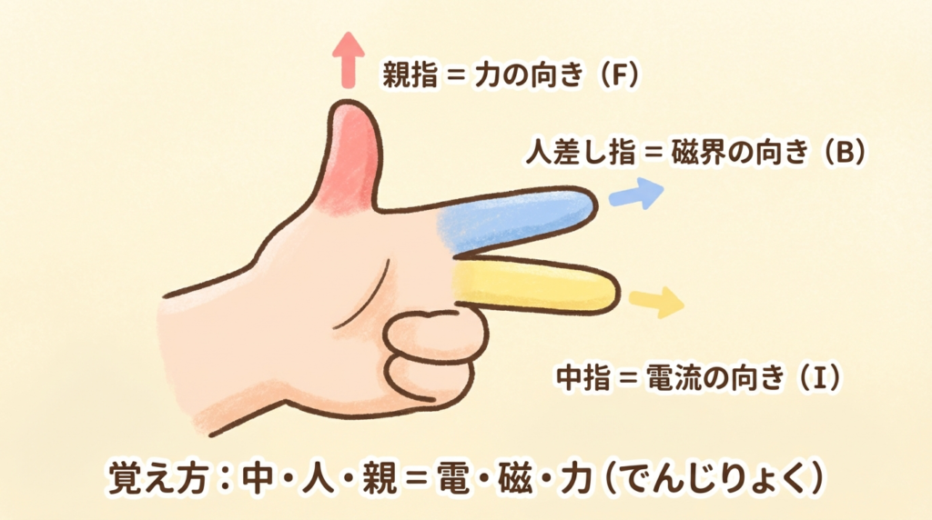 覚え方:「電・磁・力」=「中・人・親」。中指から順に「でんじりょく」と唱えながら指を向ければ、力の方向がわかります。