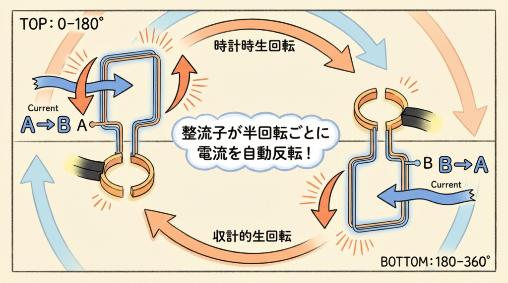 🔄 整流子の仕組み|半回転ごとに電流を「反転」させる