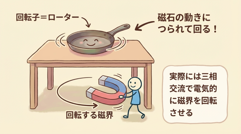 テーブルの上にフライパン(=回転子)を置いて、その下から磁石をグルグル回すと想像してください。フライパンは金属なので、磁石の動きにつられて同じ方向に回り始めます。