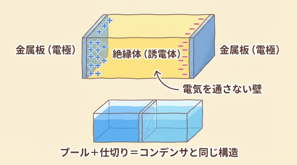 大きなプールの真ん中に透明な壁(仕切り)があると想像してください。左から水を入れると、壁の左側に水が溜まります。壁があるから右側には流れない。でも壁を取り除いた瞬間、水は一気に右側に流れ込みます。コンデンサはこの仕組みと同じ。金属板の間の絶縁体が「仕切り」の役割を果たしています。