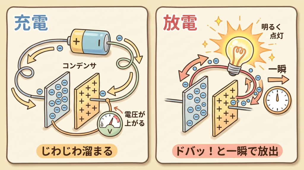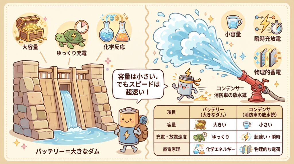 電池(バッテリー)も電気を溜める部品ですが、コンデンサは電池とはまったく別物です。電池が「大きな貯水池」だとすると、コンデンサは「小さなバケツ」。容量は小さいけど、水を入れるのも出すのも一瞬です。