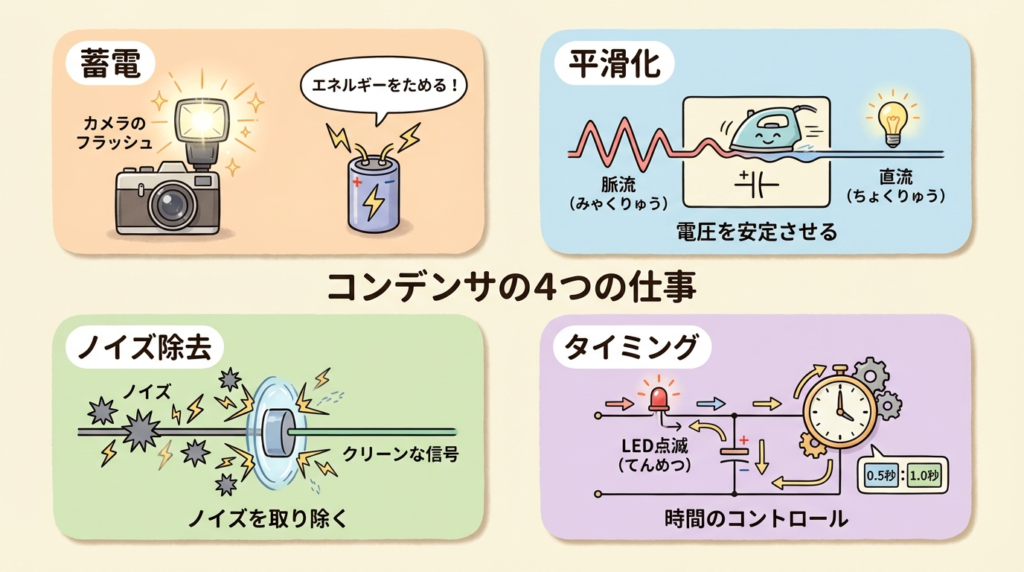 コンデンサは「電気を溜めるだけの部品」ではありません。電子回路の中で、実にさまざまな役割を担っています。ここでは代表的な4つの働きを紹介します。
