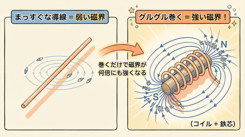 まっすぐな導線に電流を流すと、導線の周りにわずかな磁界(磁石の力の場)が生まれます。これをグルグル巻くと、1巻き分の磁界が何十回、何百回と重なり合い、まるで磁石のように強い磁界を作ることができるのです。
