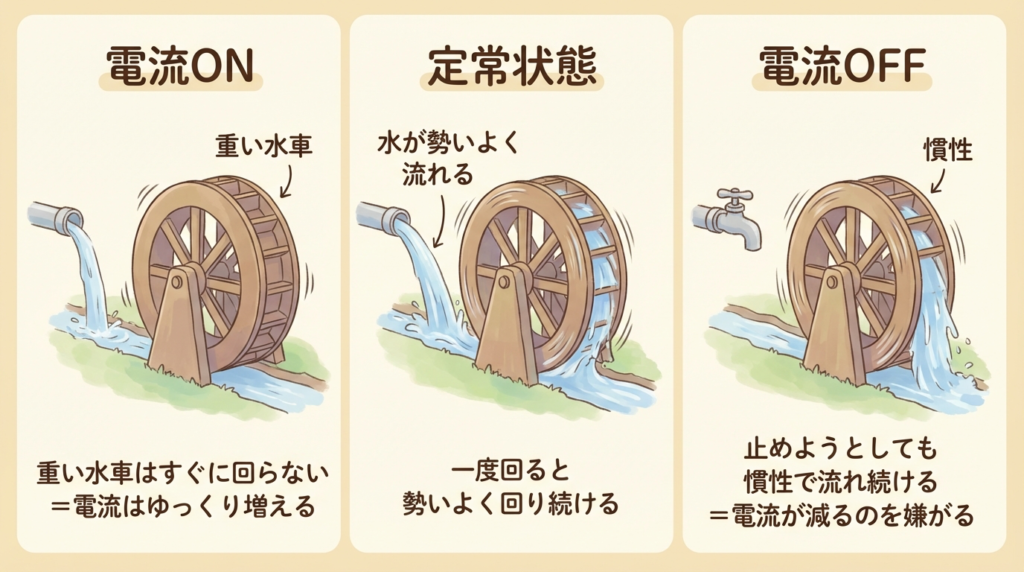 水車のたとえに戻ると、インダクタンスは「水車の重さ」に相当します。重い水車ほど動き出しにくいし、止まりにくい。つまり変化を嫌がる力が強いのです。