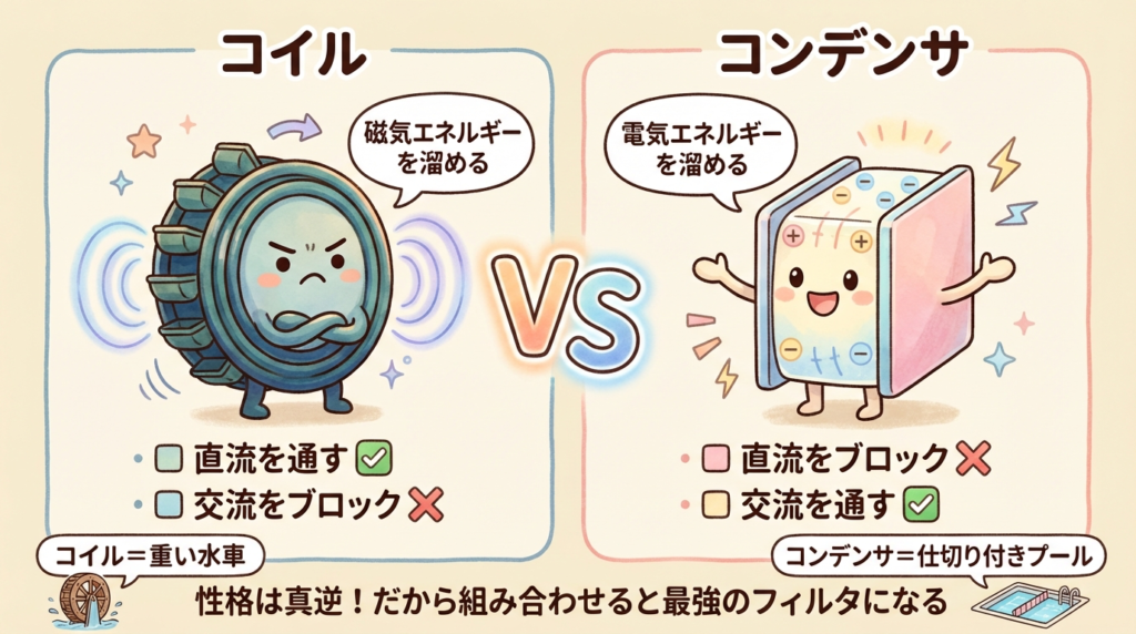 コイル vs コンデンサ|「真逆の性格」を比較表で整理