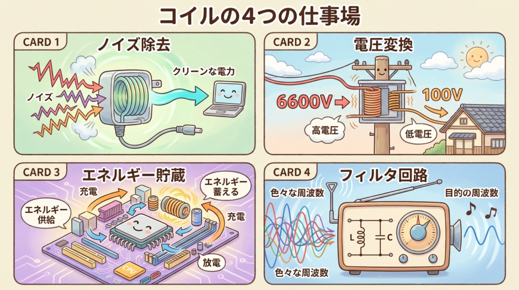 コイルは「高周波をブロック」する性質がありましたね。この性質を使って、回路に侵入する高周波ノイズをせき止める役割を果たします。スマホの充電器やACアダプタの中にはこの「チョークコイル」が入っていて、電源ノイズから精密な電子回路を守っています。