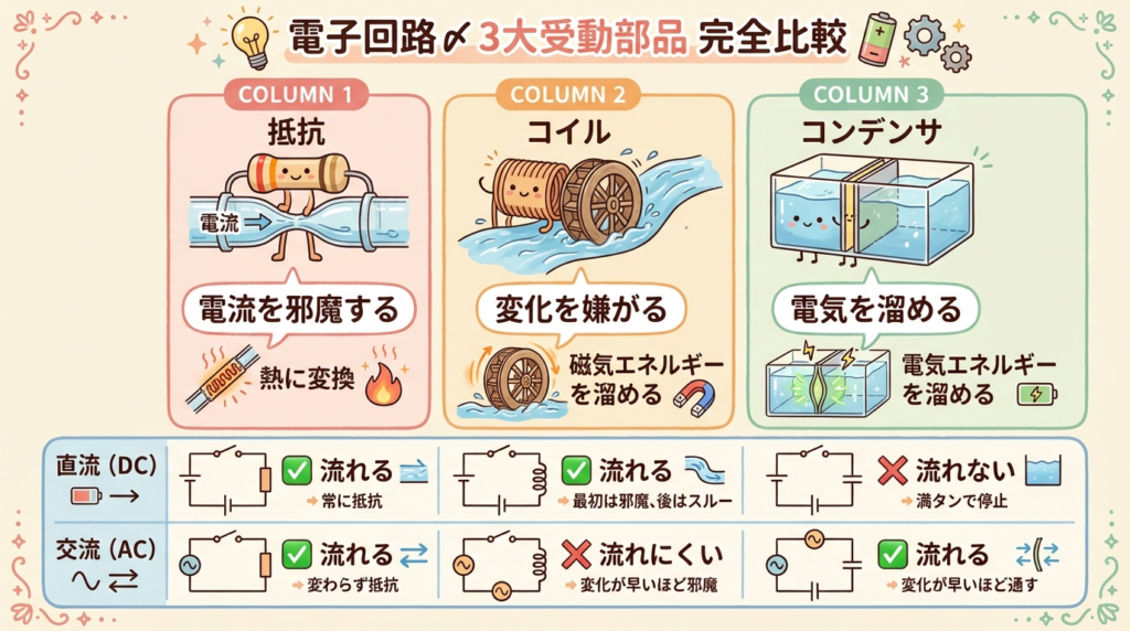 最後に、電子回路の3大受動部品(抵抗・コイル・コンデンサ)を横並びで整理しましょう。この表を頭に入れておくと、回路の動きが直感的にわかるようになります。