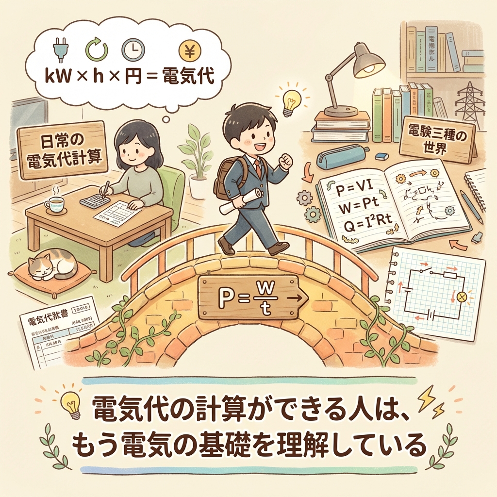 そしてこの「電力(W)× 時間(h)= 電力量(Wh)」という関係式は、実は電気工学の基本公式そのものです。電験三種の理論科目では、この概念をさらに深掘りして学びます。日常のお金の計算が、そのまま電気の専門知識につながっているのは面白いですよね。
