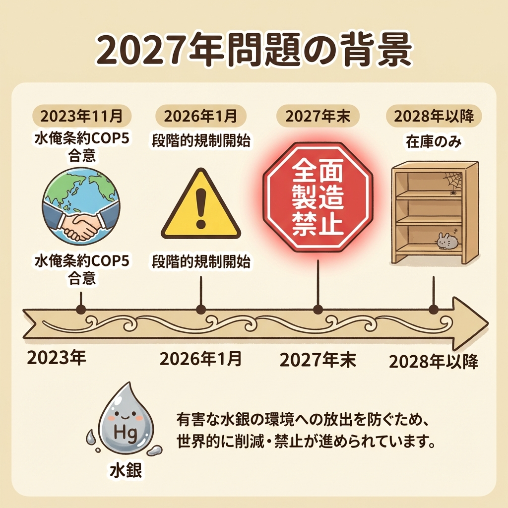 2023年11月の「水銀に関する水俣条約 第5回締約国会議」で決定された、すべての一般照明用蛍光灯の製造・輸出入を2027年末までに禁止するという国際合意。すでに2026年1月から段階的に規制が始まっており、蛍光灯の価格上昇と品薄が現実のものとなっています。