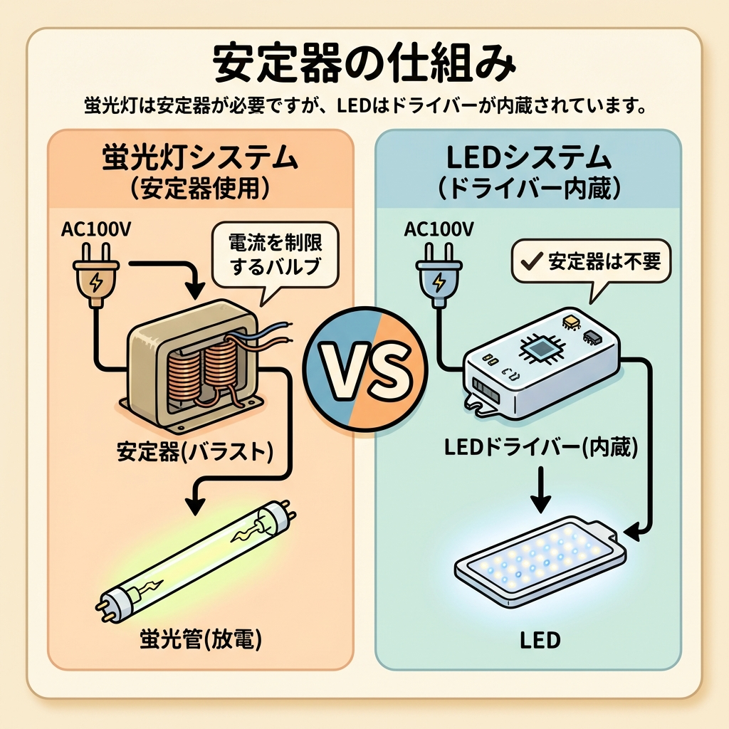- 「工事不要」と「工事必要」を分ける安定器の仕組みを図解