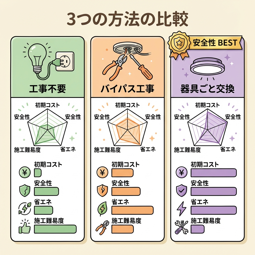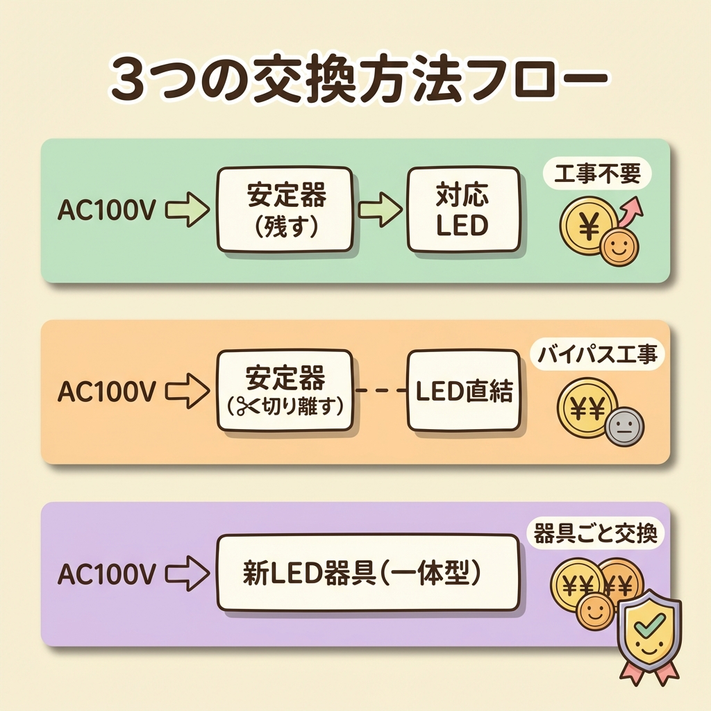 蛍光灯からLEDへの交換方法は、大きく分けて3つあります。それぞれの仕組み・費用・リスクを比較します。