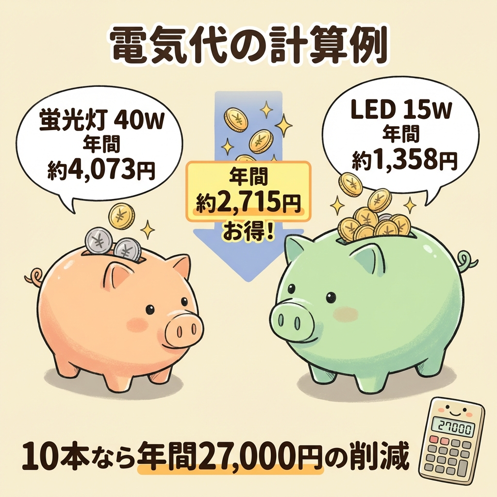 | 電気代の削減 | 蛍光灯40W → LED15W で年間約2,700円/本の削減。2〜3年で元が取れる |