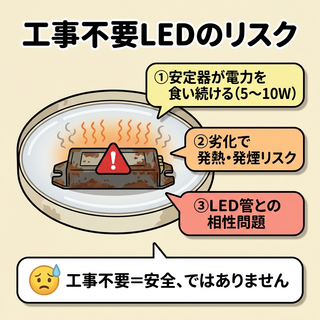安定器が残っているため、安定器自体が電力を消費し続けます(約5〜10W)。省エネ効果が減ります。さらに、安定器には寿命(約8〜10年)があり、安定器が劣化すると発熱・発煙・最悪の場合は発火のリスクがあります。「工事不要」は手軽ですが、長期的には安全面でリスクが残ることを理解してください。
