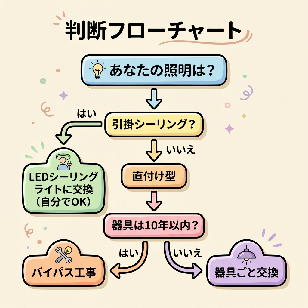→ ①工事不要LEDで一時対応(後日、②か③に切り替え推奨)
