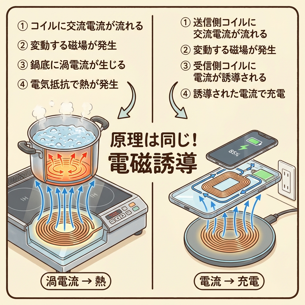 IHが「磁力で鍋を加熱する装置」なら、ワイヤレス充電器は「磁力でスマホに電気を送る装置」。やっていることの本質は同じです。この「IH = ワイヤレス充電」という繋がりがわかると、仕組みが一気にクリアになります。