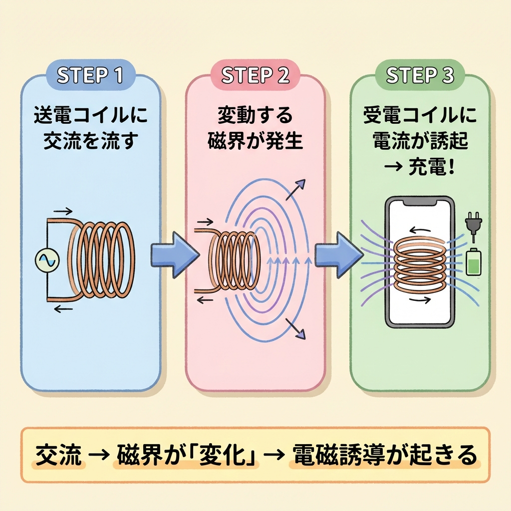 電磁誘導は「磁界が変化しているとき」だけ起きます。磁界が一定なら何も起きません。これはファラデーの法則と呼ばれる物理法則で、「コイルを貫く磁束の変化量に比例して起電力が生まれる」と表現されます。ワイヤレス充電器が「交流」を使う理由は、常に磁界を変化させ続けるためです。