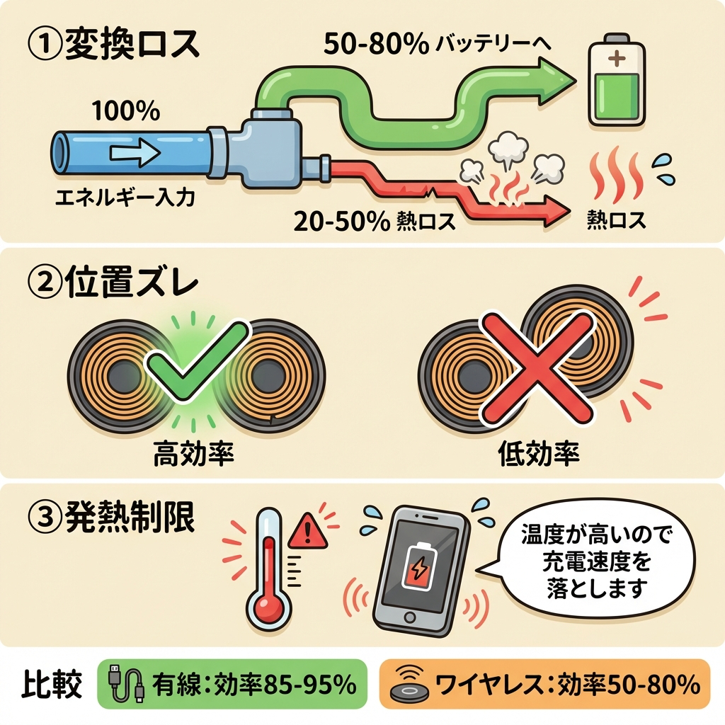 | 1 | エネルギー変換ロス | 有線は電気をそのまま送る(効率85〜95%)。ワイヤレスは「電気→磁界→電気」と2回変換するためロスが大きい(効率50〜80%)。10W出力しても実際にバッテリーに届くのは5〜8W程度 |