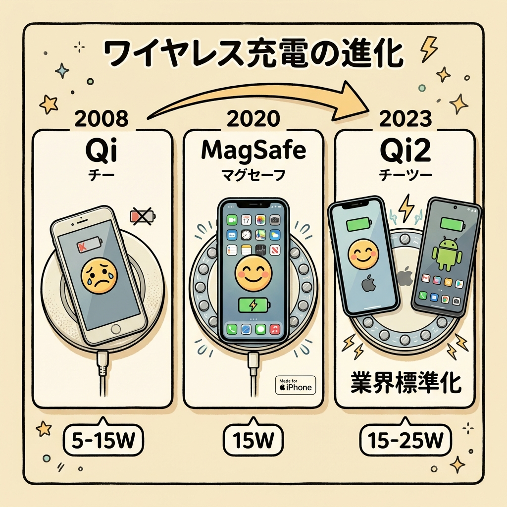 先ほど「コイルの中心がズレると充電効率が落ちる」と説明しました。実はワイヤレス充電規格の進化の歴史は、まさにこの「位置ズレ問題」を解決する歴史です。