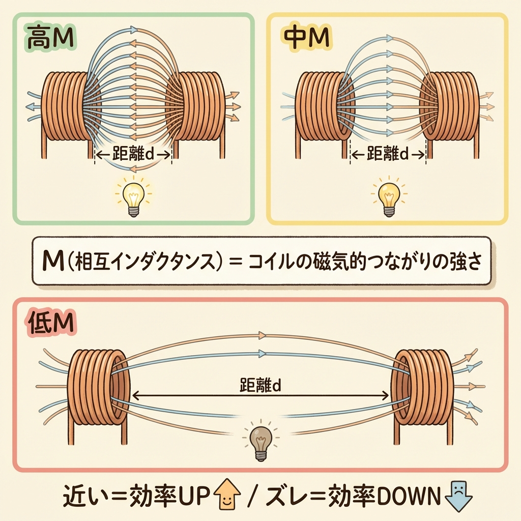 逆に言えば、コイルの距離が離れたり中心がズレたりすると、Mが小さくなり、充電効率がガクッと落ちます。スマホケースが分厚いと充電が遅くなるのも、コイル間の距離が増えてMが低下するためです。