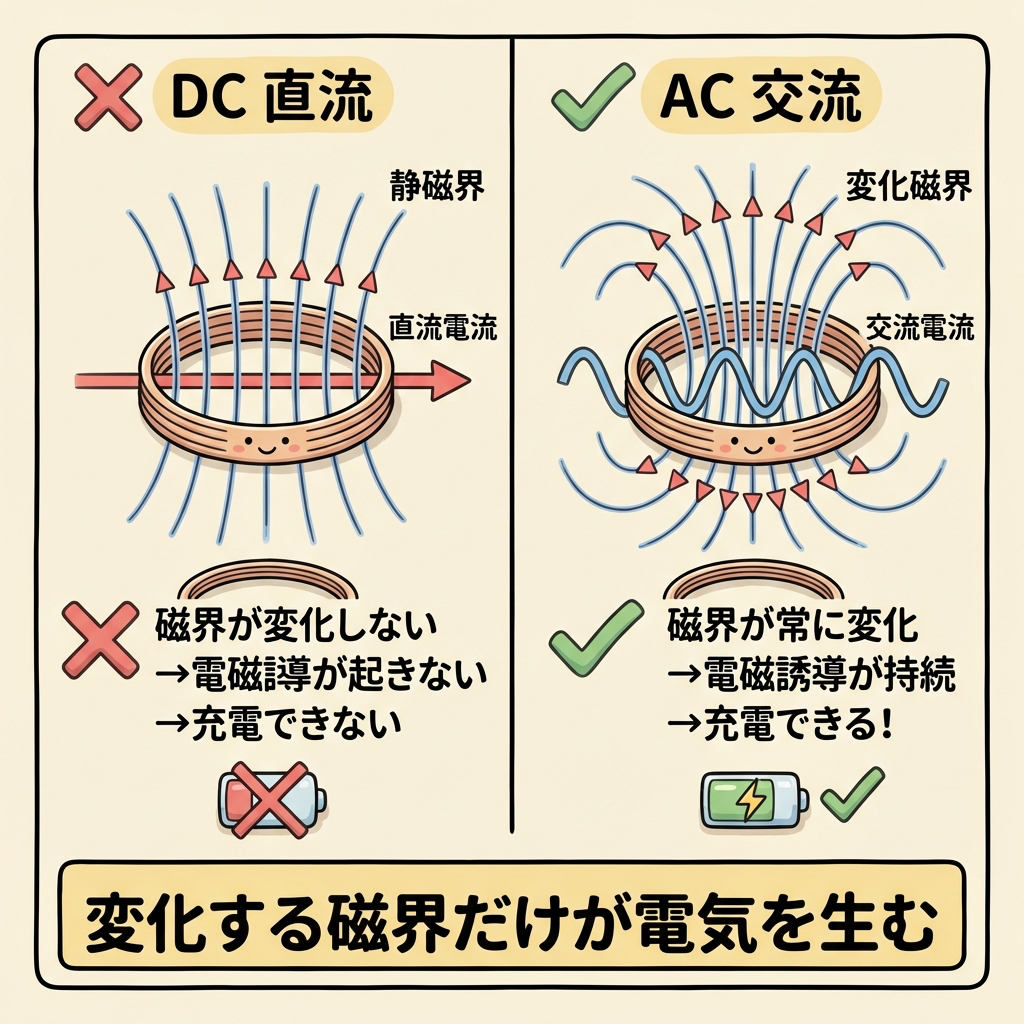 もう少し詳しく言うと、STEP 1で充電器に流れるのは交流(AC)です。交流はプラスとマイナスが周期的に入れ替わるため、コイルの周りに発生する磁界も常に「変化」しています。この「変化する磁界」こそが、離れた場所にあるスマホのコイルに電圧を誘起するカギです。もし直流(DC)を流したら、磁界は一定のまま変化しないので、電磁誘導は起きません。