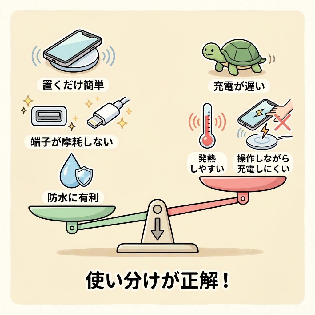 | 発熱しやすい | 変換ロスの分が熱に変わる。長時間のワイヤレス充電はバッテリーへの負担が有線より大きい |