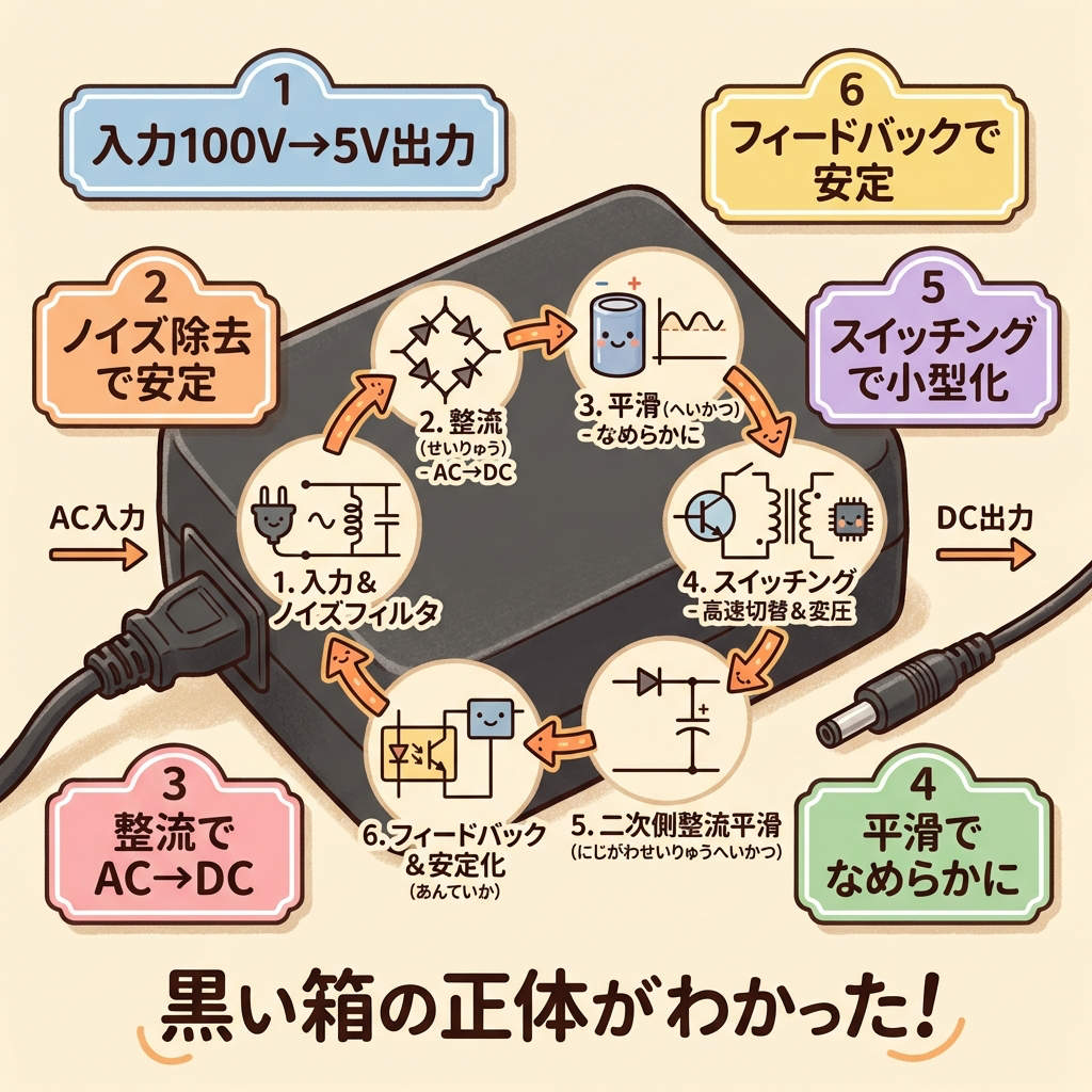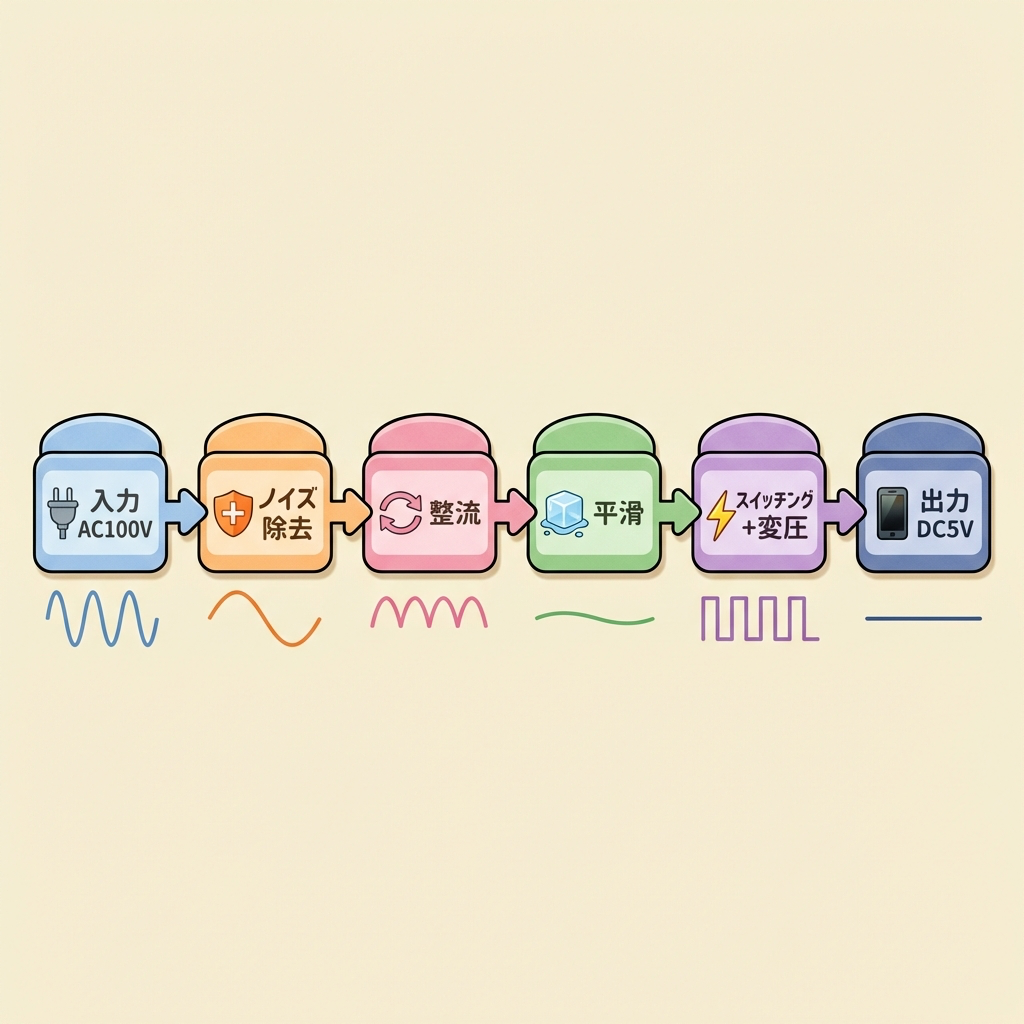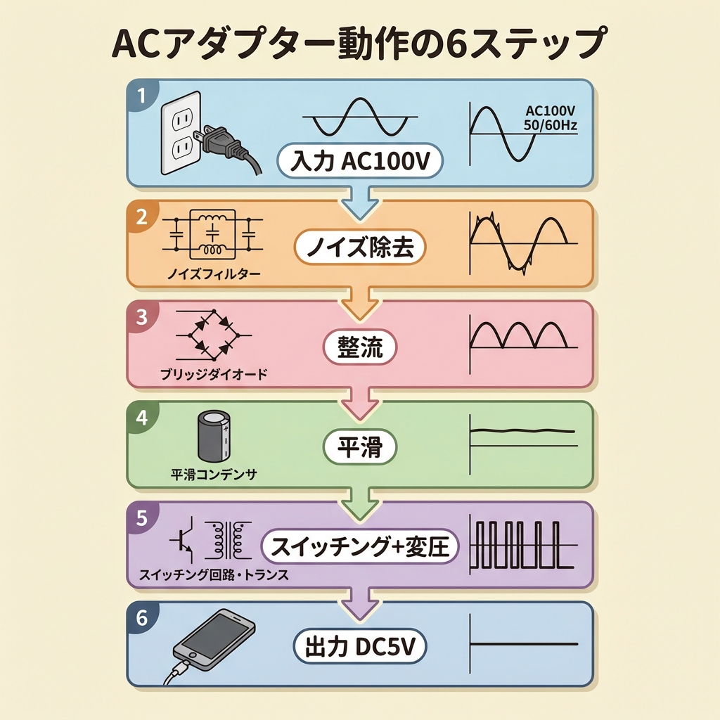 コンセントのAC100V(交流)が、スマホやノートPCが使えるDC5V〜20V(直流)に変わるまでには、6つのステップがあります。まずは全体像をつかんでください。