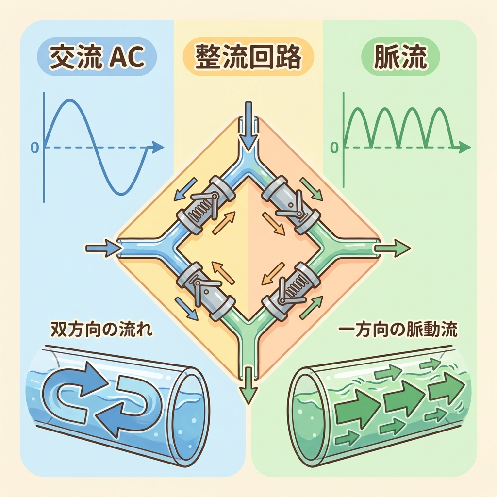 水道管に例えると、「行ったり来たりしていた水」が「一方向にだけ流れるようになった」状態です。ただし、まだ水流は ドクドクと脈打っている(波打っている)状態。一定の強さでスムーズに流れているわけではありません。この「波打つDC」を 脈流(みゃくりゅう) と呼びます。