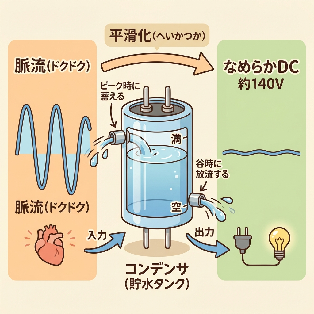 整流でできた「脈流」は、まだドクドクと波打っています。これをなめらかな直流にする工程が 平滑(へいかつ) です。