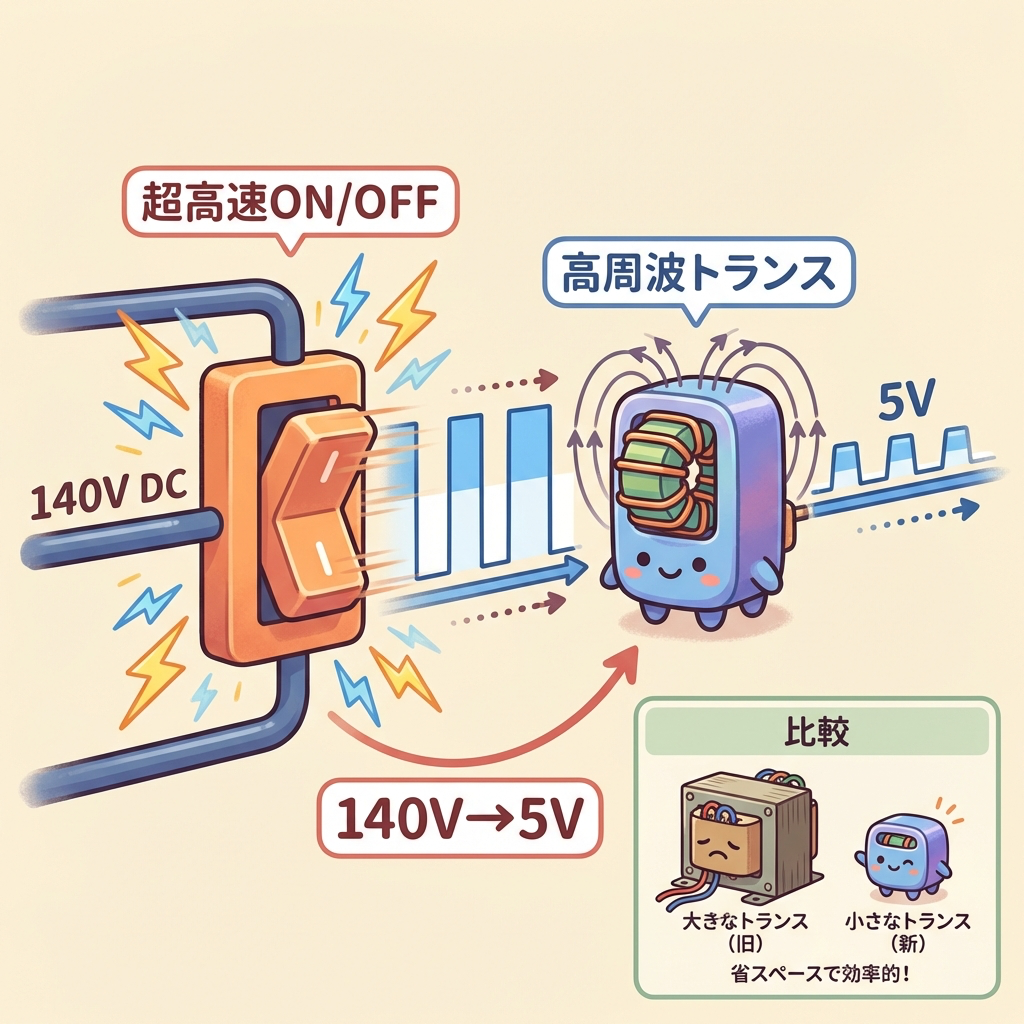 ⑤ スイッチング+変圧:超高速ON/OFFで高周波パルスを作り、小型トランスで140V→5Vに変圧