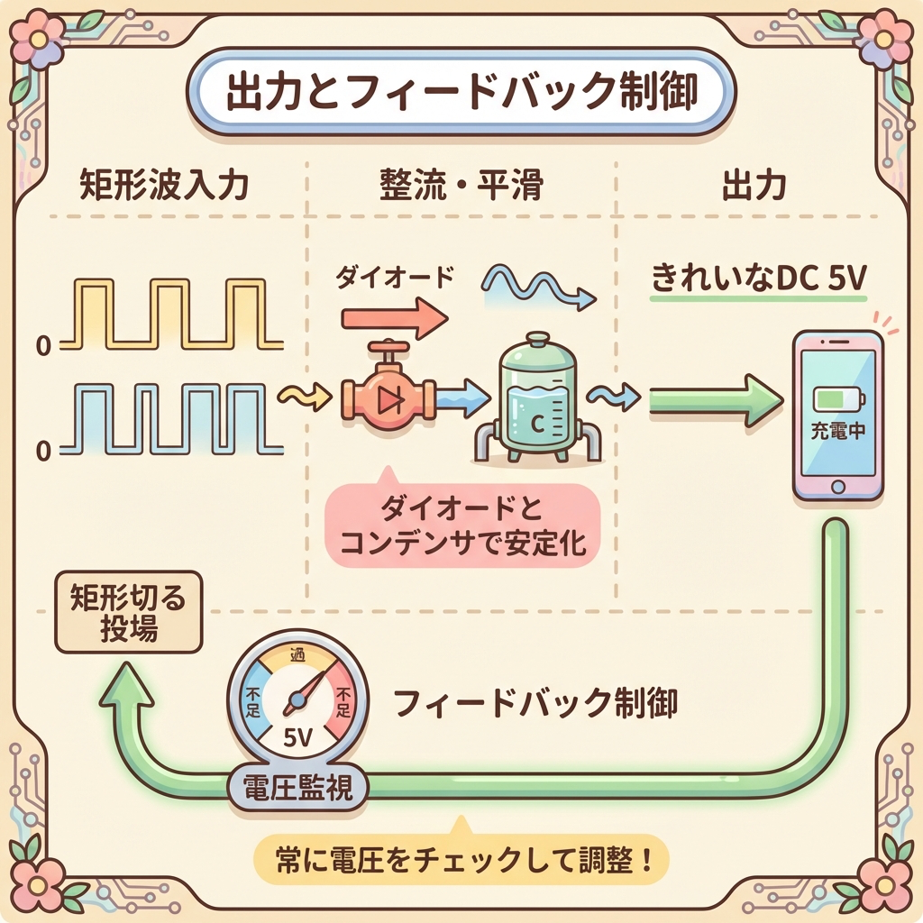 ACアダプターの出口には、出力電圧を常に監視する フィードバック回路 が付いています。出力電圧が下がりそうになったら「もっとON時間を長く!」、上がりそうになったら「もっとON時間を短く!」とスイッチング回路に指示を出し、常に ぴったり5V を維持します。