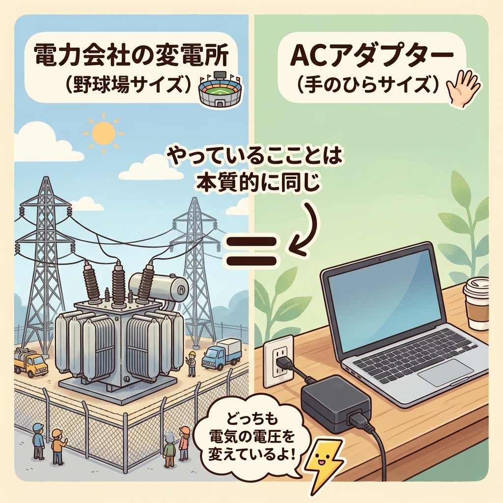 記事の冒頭で「ACアダプターは超小型の変電所」と書きました。これは比喩ではなく、本質的に同じことをやっています。比較してみましょう。