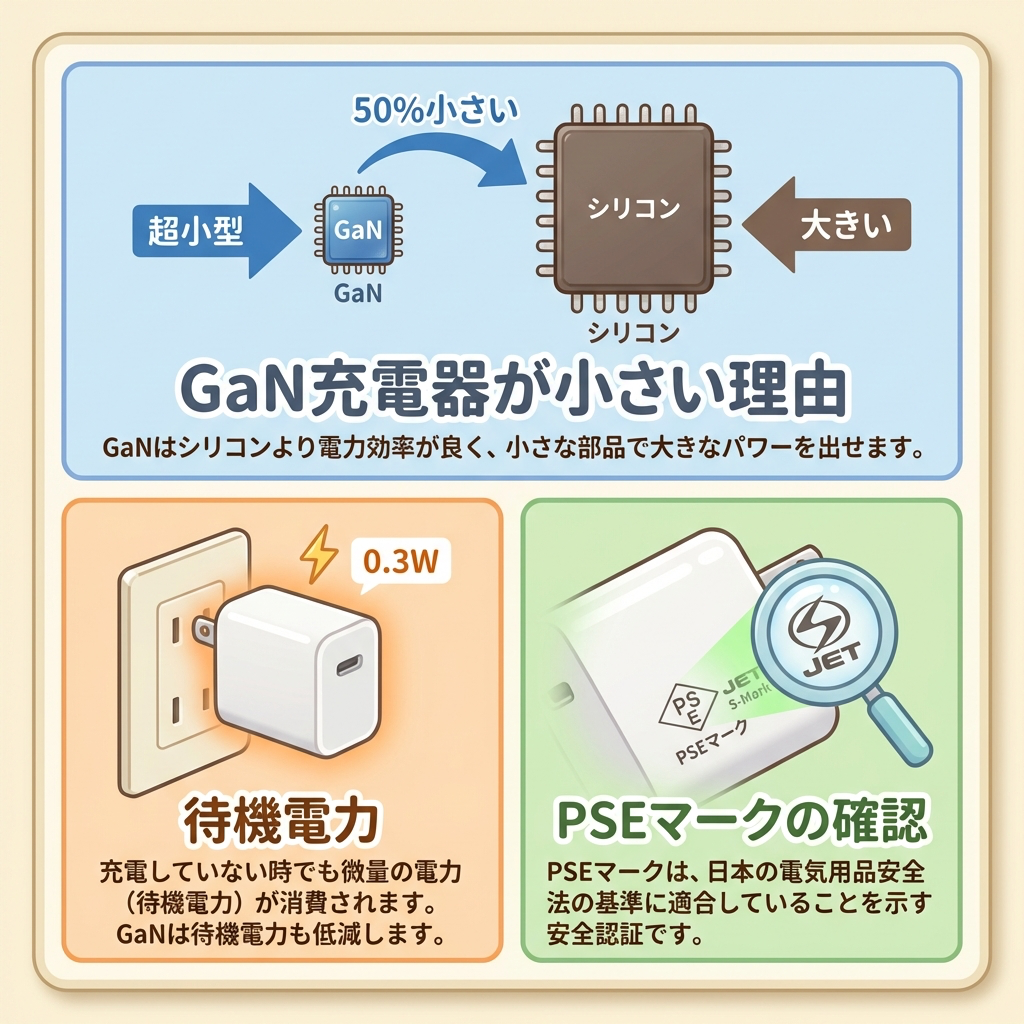 最大の理由は GaN(窒化ガリウム) という新しい半導体素子の普及です。従来のシリコン製トランジスタよりスイッチング速度が速く、損失(=熱)が少ないため、同じ電力でもより小型・軽量に作れるようになりました。2020年以降、GaN採用の充電器が急速に増えています。