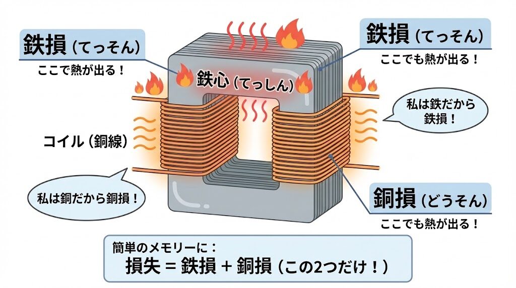 変圧器の損失は「鉄損」と「銅損」の2種類だけ。