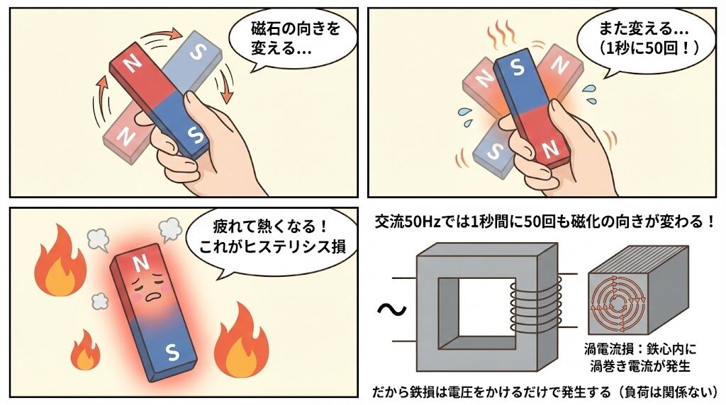 交流は1秒間に50回も向きが変わるので、鉄心の磁化も50回ひっくり返ります。