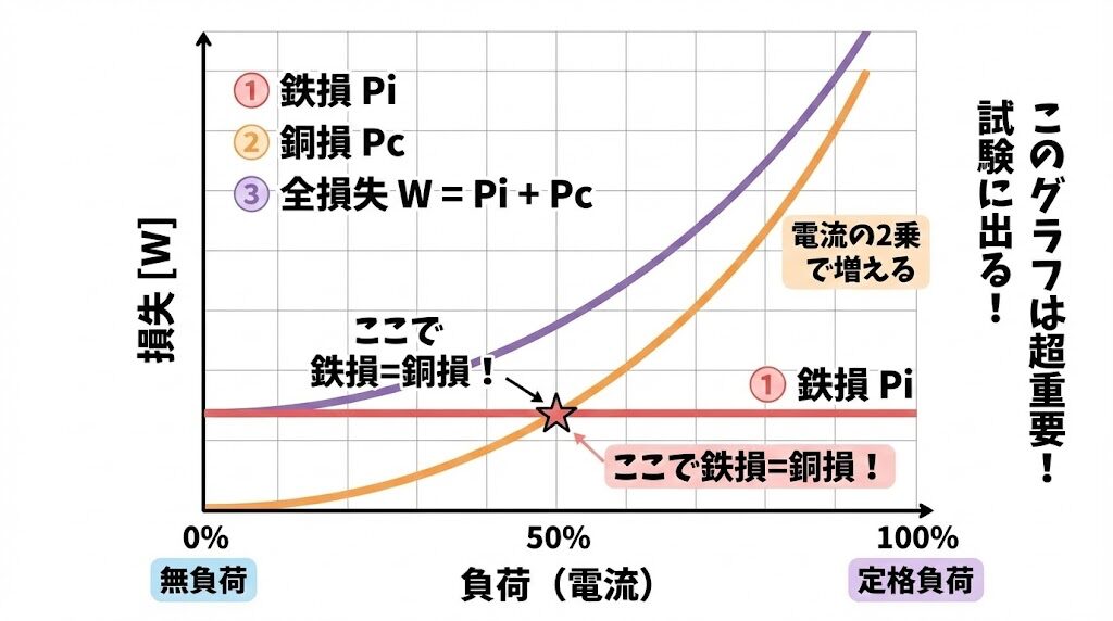 特に「鉄損=銅損で最大効率」は必ず覚えてください!