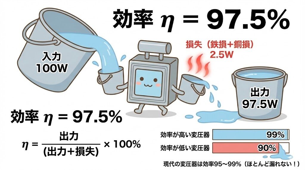 変圧器の効率(η:イータ)とは、入力したエネルギーのうち、何%が出力として使えるかを表す値です。