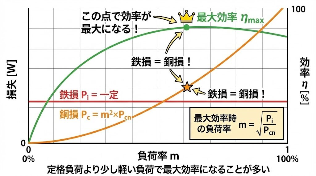 - 最大効率の条件:鉄損 = 銅損(超重要!)