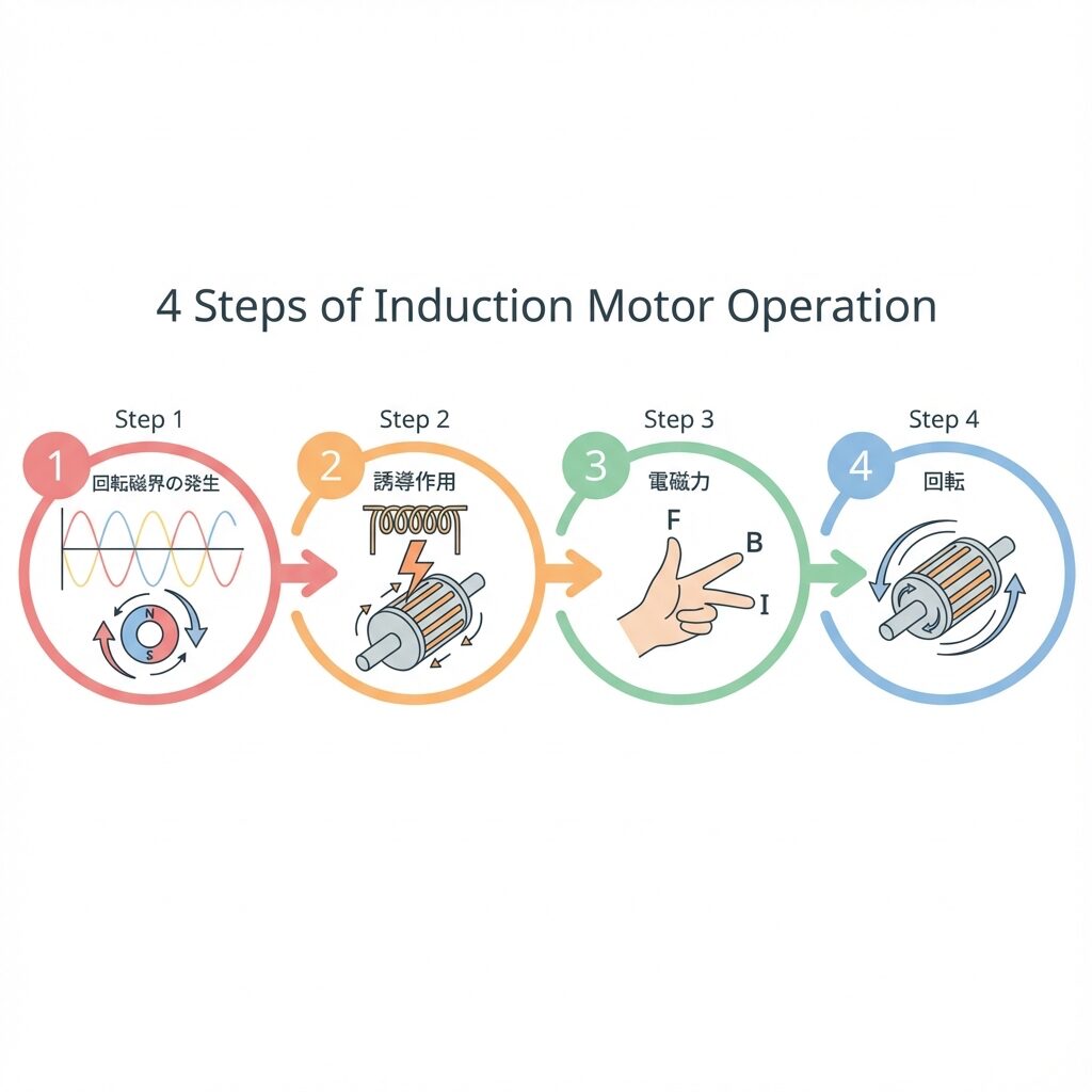 三相誘導電動機の動作原理は、以下の4ステップで完全に理解できます。