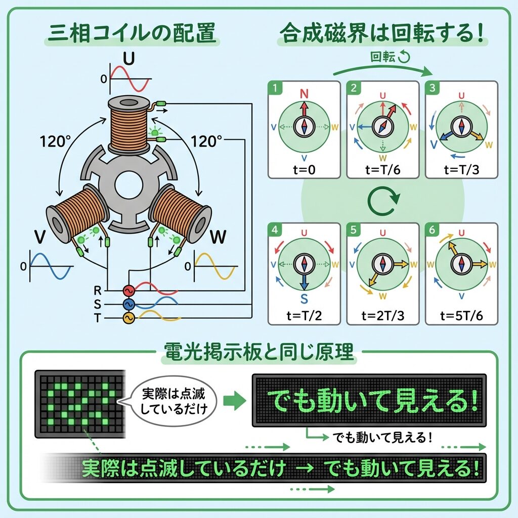 | 回転磁界 | 三相交流 × 120°配置のコイル |