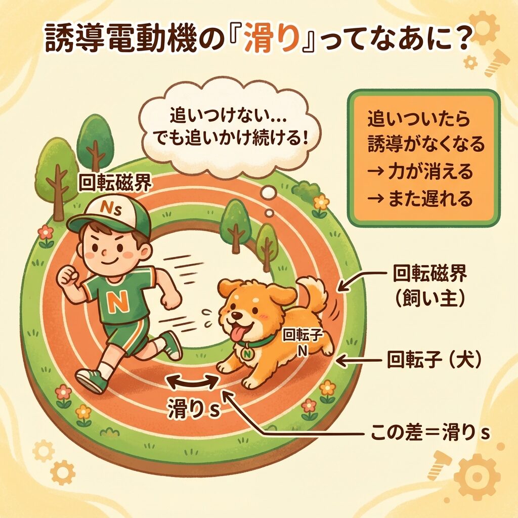 常に少しだけ遅れて回転し続ける。この「少しだけ遅れる」ことを滑り(すべり)といいます!