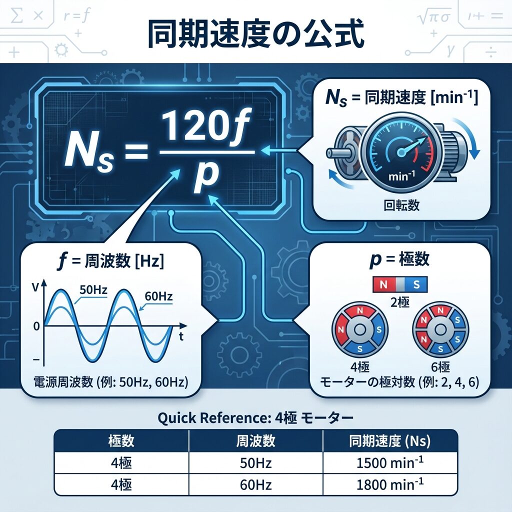 | 同期速度 | Ns = 120f / p [min⁻¹] |