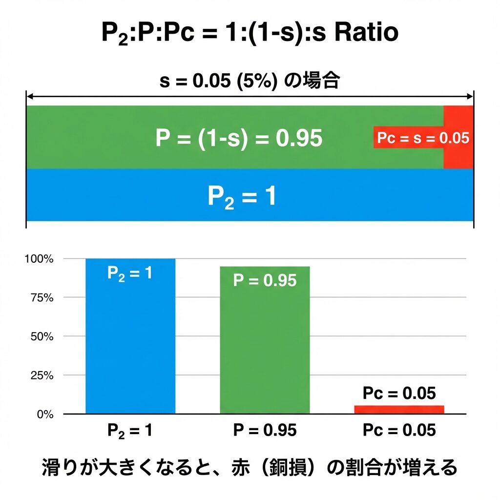 二次入力 : 出力 : 銅損 = 1 : (1-滑り) : 滑り