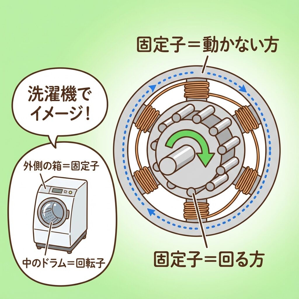 洗濯機の「外側の箱」が固定子。中のドラム(回転子)は回るけど、外側はしっかり固定されている。固定子のコイルに電流を流して回転磁界を作ります。